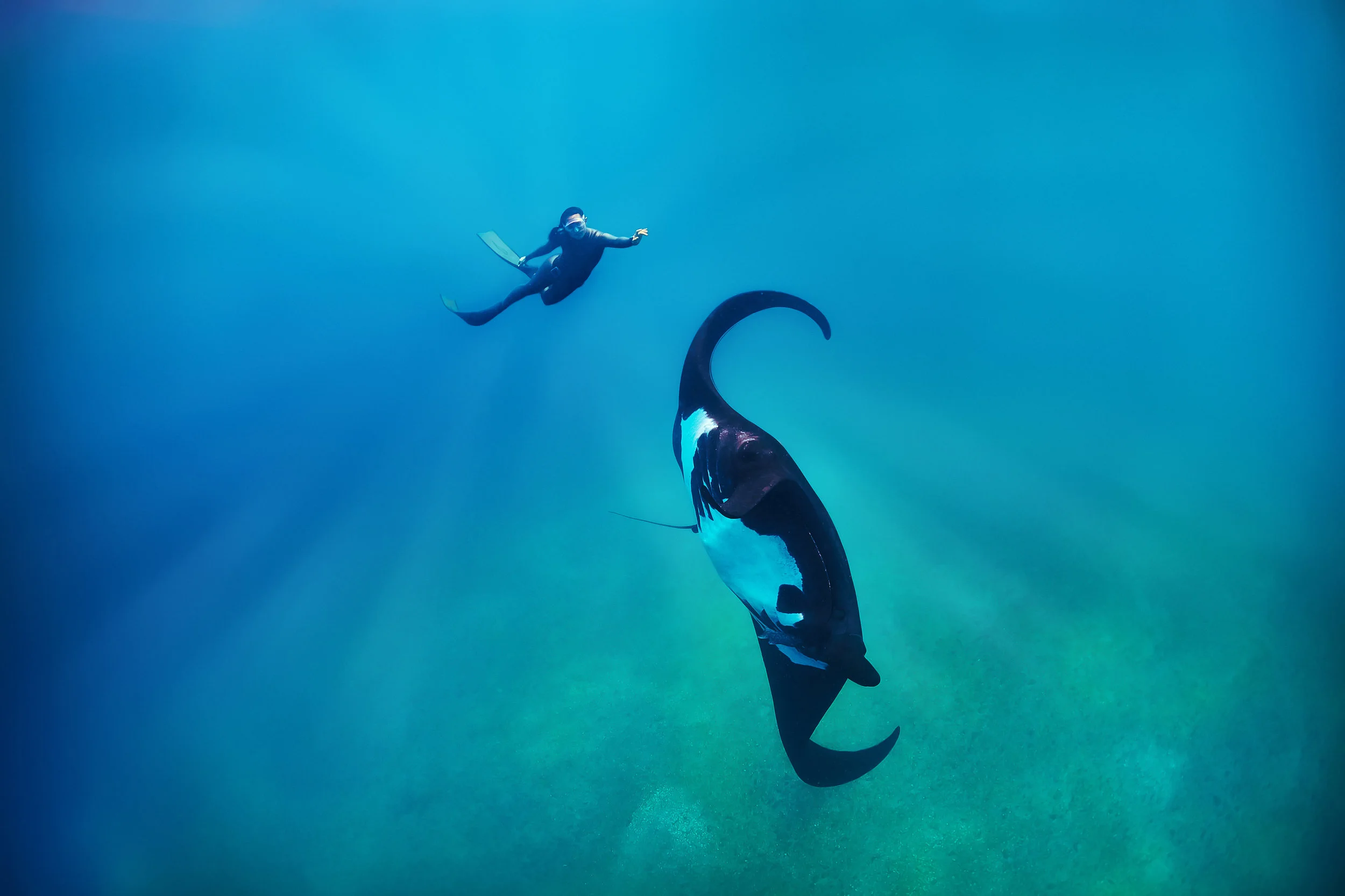 She slowly banks right, swoops like the most elegant bird imaginable and comes in right under me. Her heavily lided eye the size of a golf ball settles on me and we dance. My arms out, her wings stroking water as she glides alongside.