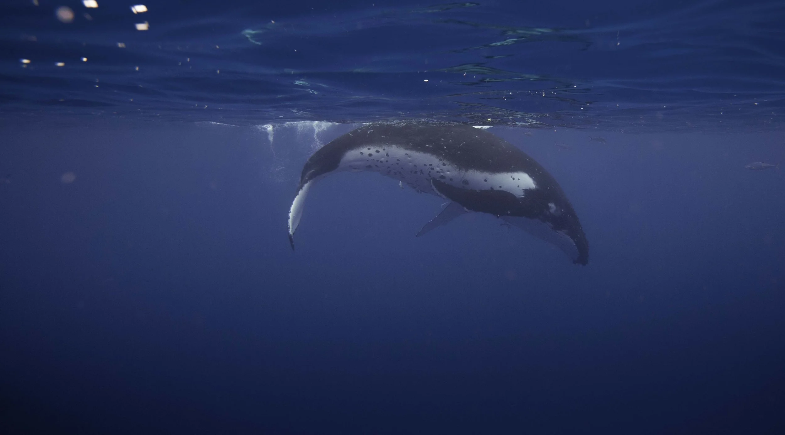 'Suspended in deepest blue with sunrays slicing down from the surface to the depths I feel him sing. Floating fifteen meters above him we don’t matter in the least, we hardly move – our eyes and hearts fixed on the outline of white whale-tail glinting below, enveloped in a cloud of sound foreign to any terrestrial being, it is not only a listening experience - in water sound comes from all directions at once and if loud enough penetrates your skin, muscle and bone until you are vibrating in the throes of something much greater than simple listening. The singing humpback male hangs suspended in blue water below us while we hang suspended in his song.