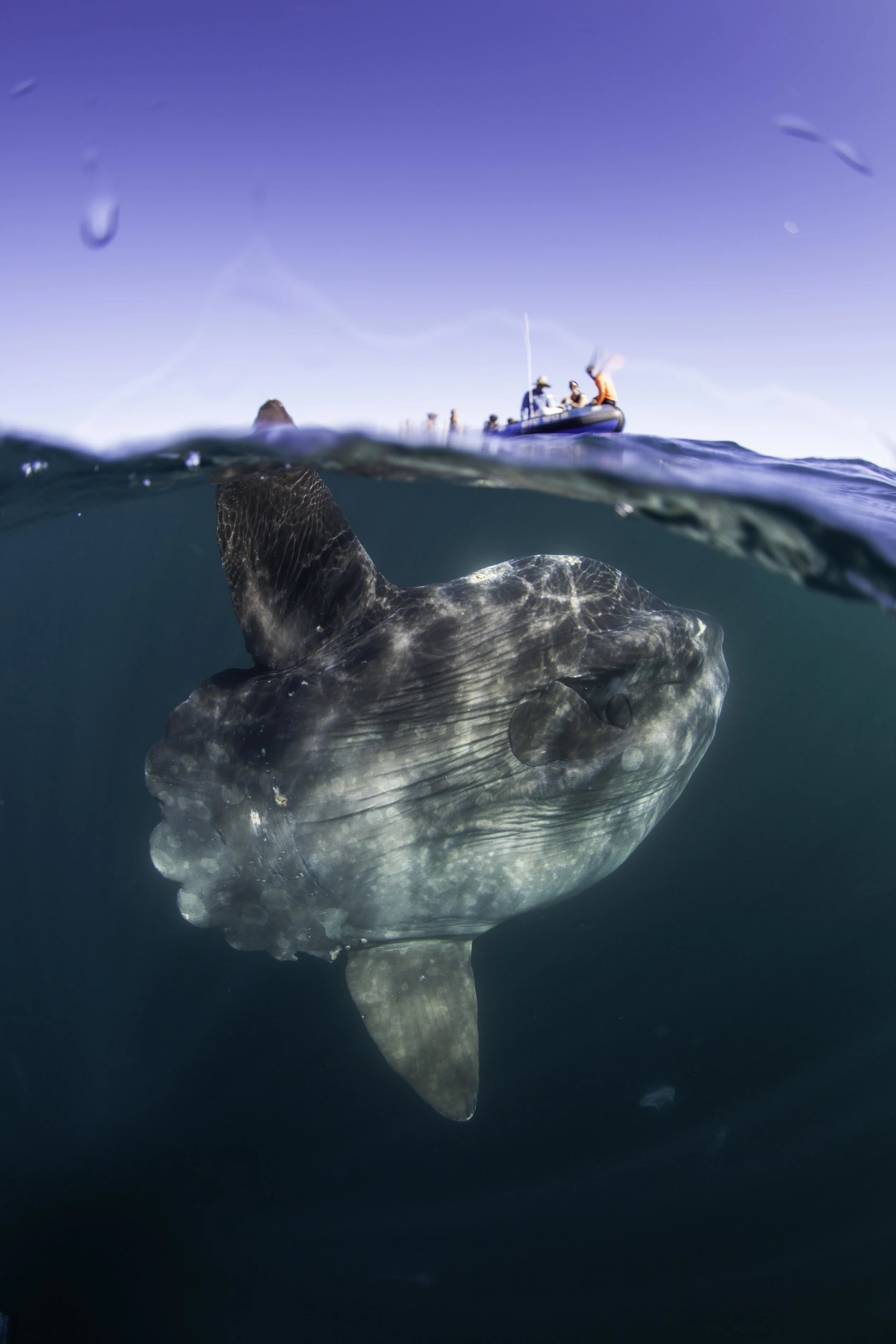 Here a Mola Mola, or Sunfish swims right past the Animal Ocean dive boat in Cape Town. Being still in the water and using no artificial light Peter was able to spend an unusually long time in the water with this large fish.